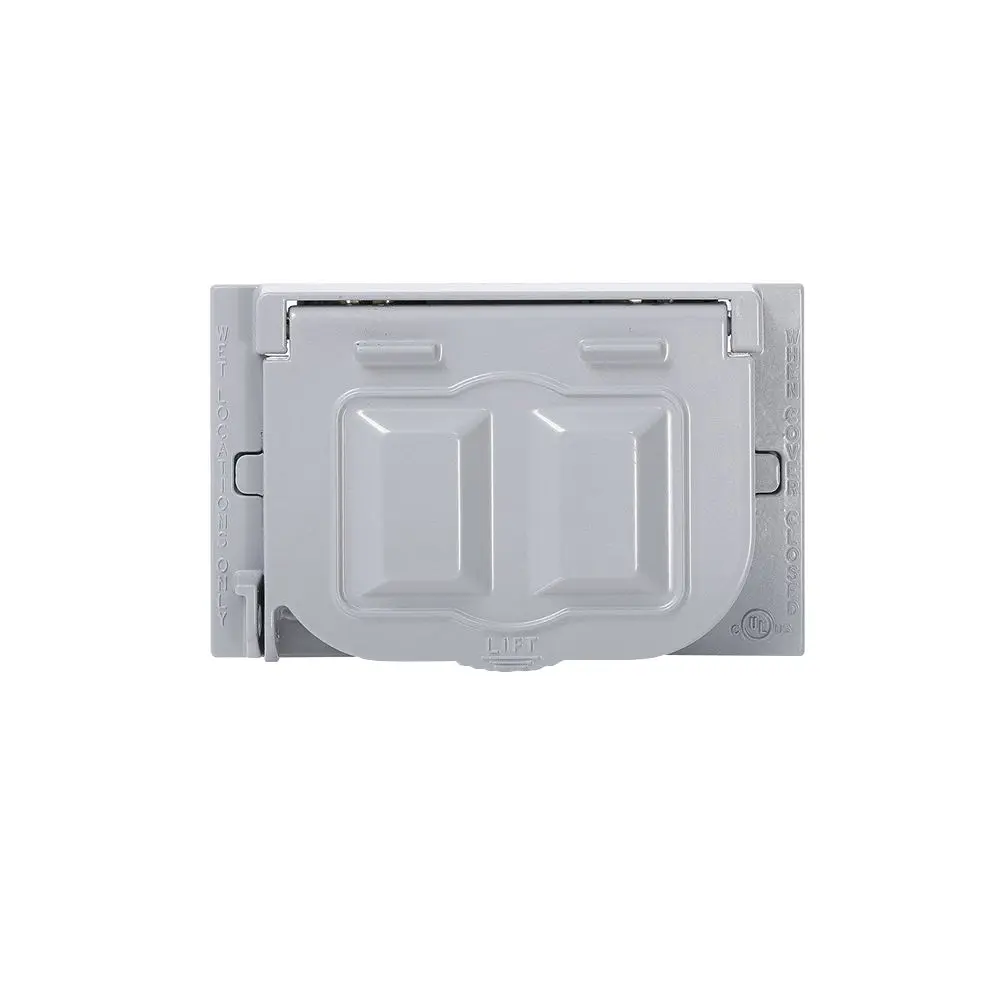 Placa hermética para tomacorriente doble. Material: cuerpo y tapa de aluminio color gris. Mantiene la hermeticidad solo cuando está instalado en posición horizontal y no está conectado el enchufe. Incluye empaque y tornillo para su instalación. Certificación: UL.