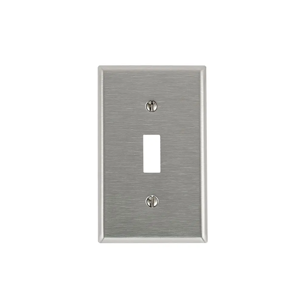 Placa para 1 interruptor tipo palanca. Material: acero inoxidable con acabado satinado. Incluye 2 pernos para su fijación. Certificación: UL.