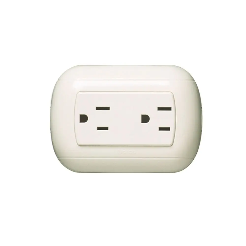 Tomacorriente doble 2x15A+T para 250V de 3 módulos, cuerpo de resina de color marfil, para empotrar en cajas rectangulares, en canaletas, etc. Montaje con enchufes con la norma NEMA 5-15P.